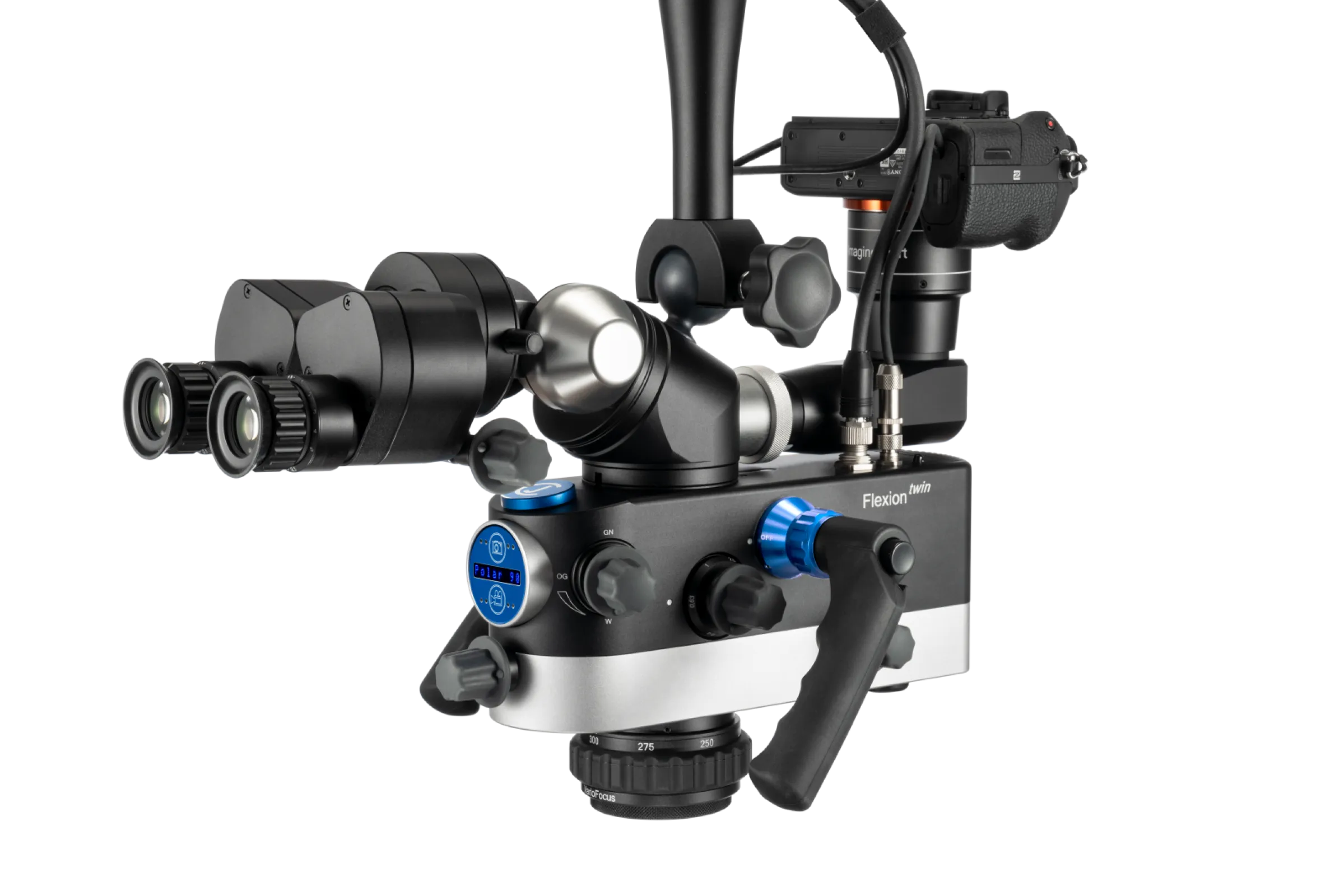 Further reading The two Flexion Twin dental microscopes with their state-of-the-art selective filter system meet the highest requirements of modern dentistry thanks to their extensive equipment features. The two Flexion models bear the designation "Twin", as both are equipped with two LEDs. The second LED in the Twin Blue generates fluorescence whereas the second LED in the Twin White doubles the light intensity.