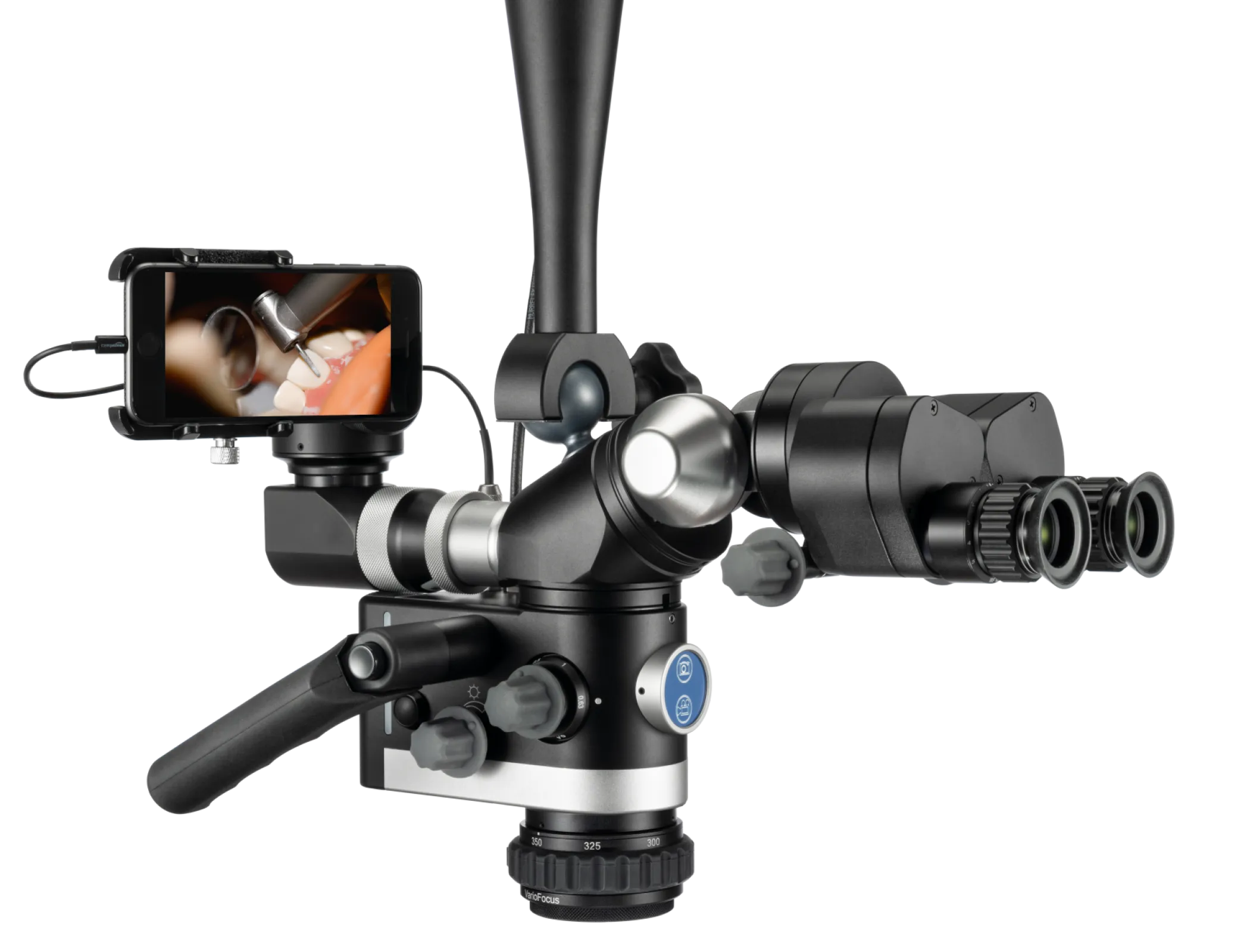 The Flexion Advanced dental microscope impresses with its excellent optics and a wide range of functions. The well thought-out ergonomics ensure an upright treatment position and a relaxed posture. Various imaging connections for full-format, APS-C cameras and smartphones are available for contemporary documentation. By means of a hand gesture, photo or video recordings can be started conveniently via the sensor unit integrated in the Flexion Advanced SensorUnit model.
