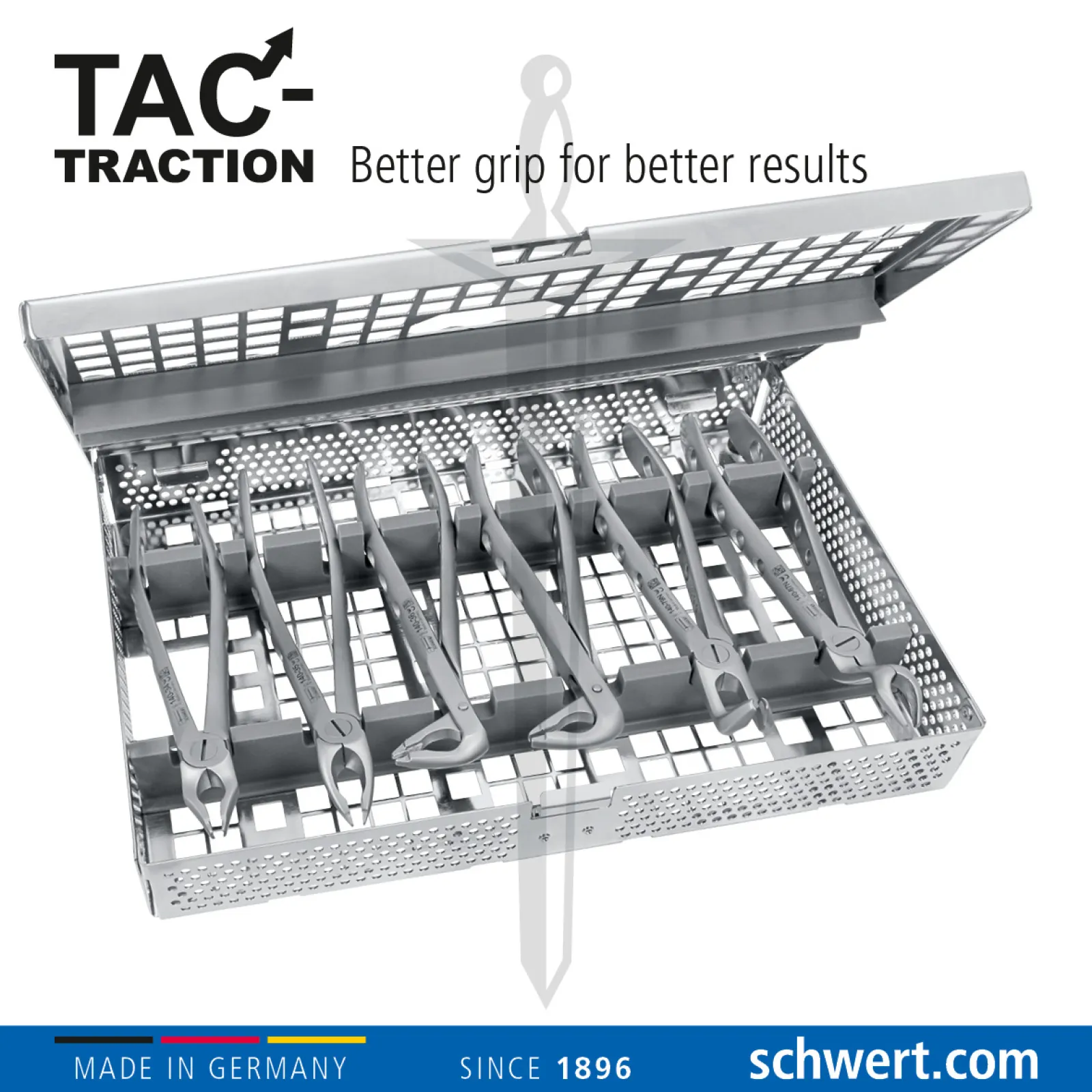 SCHWERT TAC-Traction extraction forceps allow a balanced luxation, combined with an amazing tactile feeling, due to approx. 25% weight saving. Smooth going and ergonomic handles, allow left- and right-handed people an individual positioning. Beside that they offer a steady power transmission on the tooth.